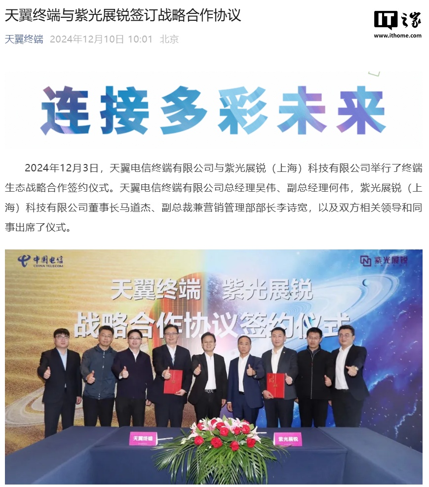 IT之家 12 月 10 日消息,天翼电信终端有限公司与紫光展锐(上海)科技有限公司 12 月 3 日举行了终端生态战略合作签约仪式。