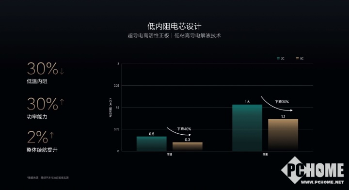 麒麟5C电池,行业领先的低温性能 低温环境下,锂离子电池电化学活性降低是导致续航下降的核心问题。理想汽车通过优化电池内阻成分,采用高活性正极材料及导电性能优异的电解液,将MEGA 5C电芯的低温阻抗降低30%,功率提升30%以上,使整车低温续航增加2%。