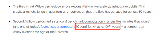 新闻稿写道,Willow可以成倍地减少错误,解决了该领域近30年来一直在研究的量子纠错的关键挑战。另外,Willow在不到五分钟的时间内就完成了一个“标准基准计算”。