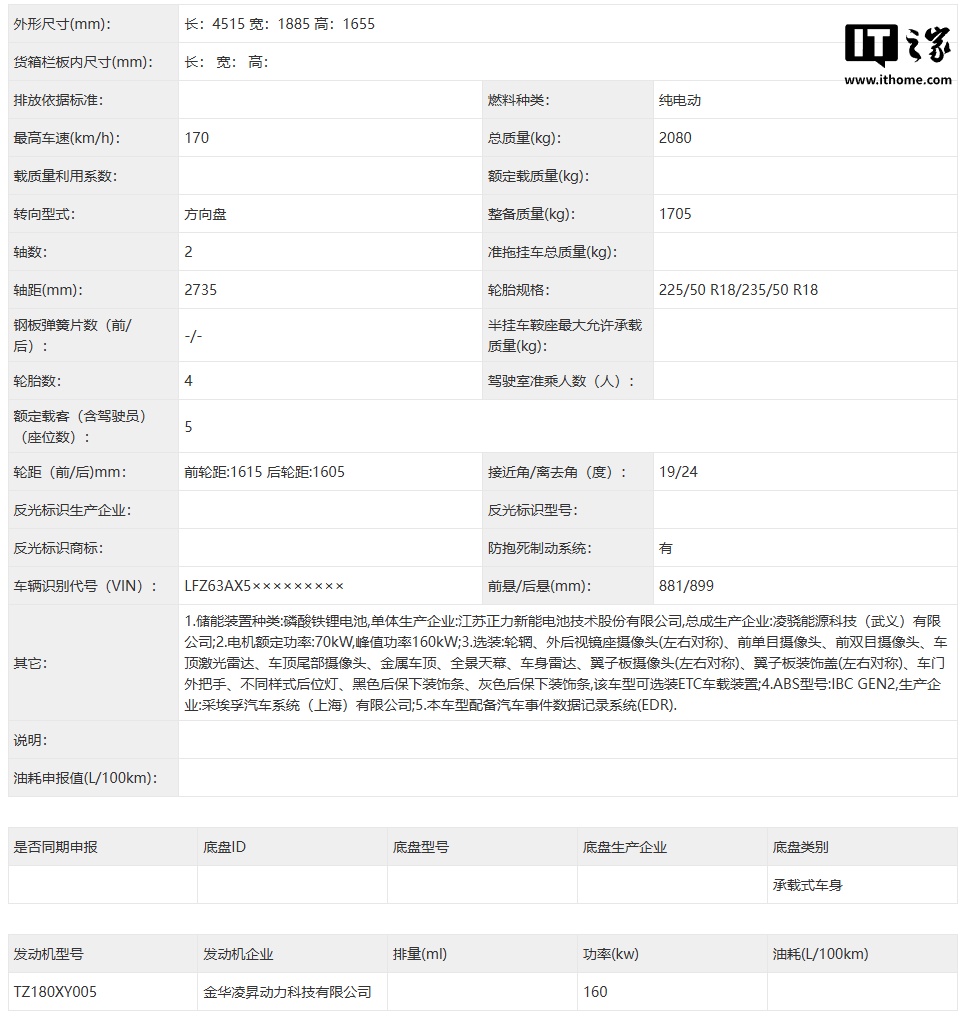 这款新车前脸采用了贯穿式头灯,配备新能源车型流行的隐藏式门把手,车尾同样配备贯穿式灯组,与前脸造型相呼应。新车长宽高分别为 4515*1885*1655mm,轴距为 2735mm,入网车型提供 132kW 和 160kW 两个单电机版本。