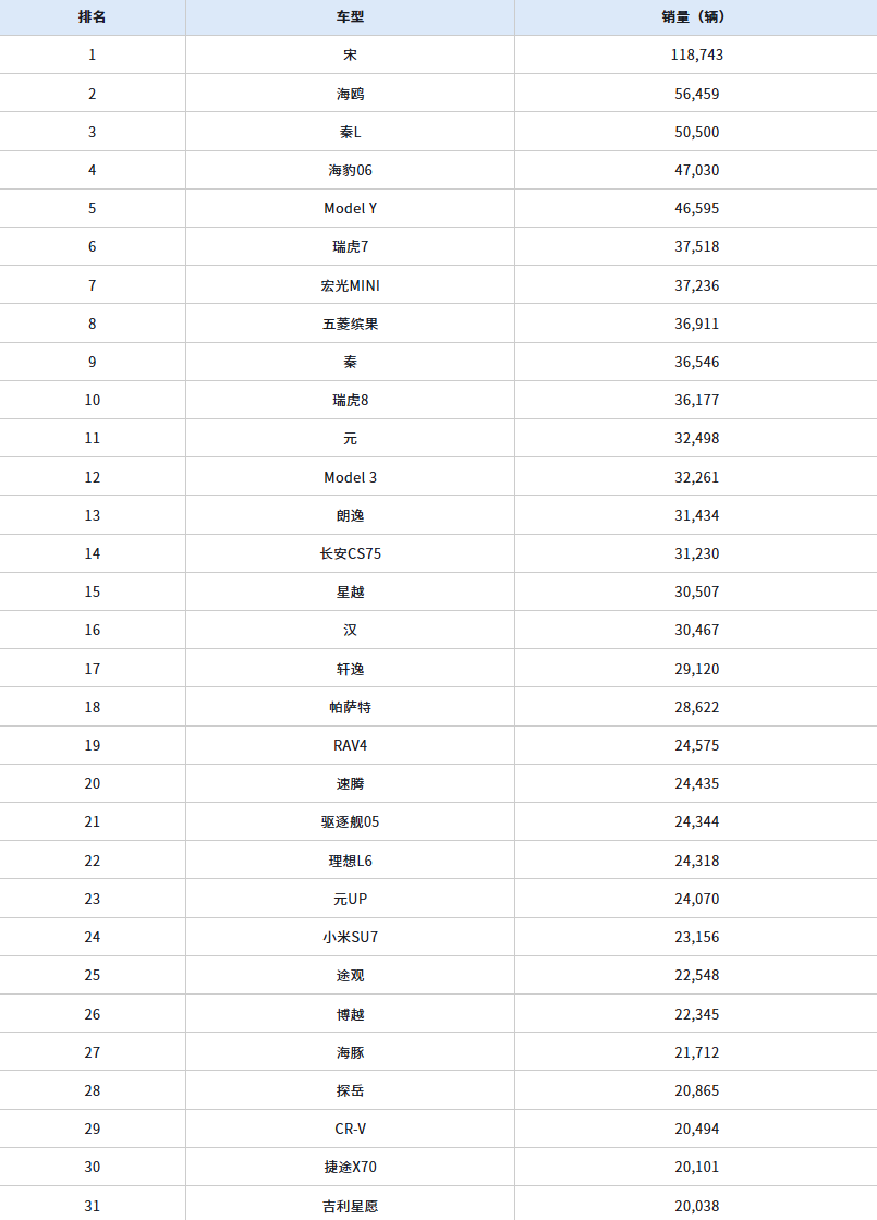 在这五个车型中,比亚迪占据了四个席位,分别是宋、海鸥、秦L和海豹06。