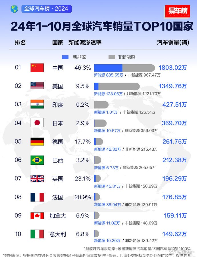 易车榜发布了今年前10月全球汽车销量Top10国家榜。榜单显示,中国前十月共计销售汽车1803.02万辆,位居榜单第一,比第二名美国多出450万辆,断层式领先。