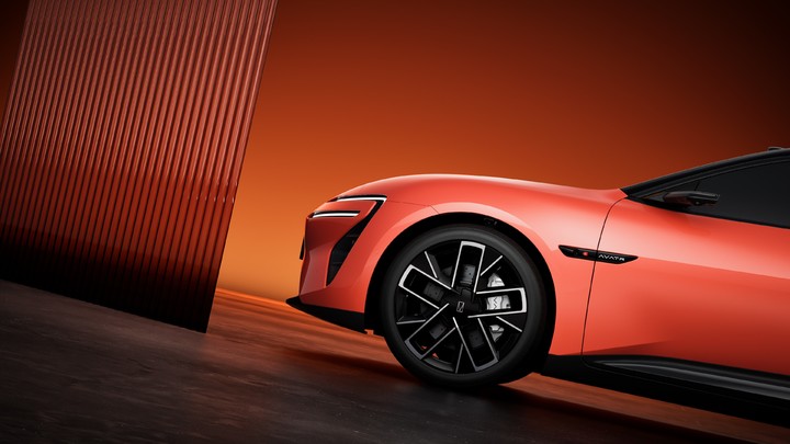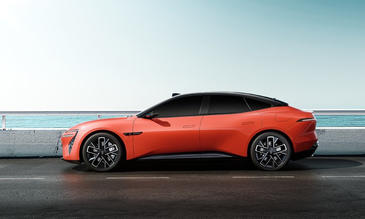 可以留意到,阿维塔 06 是第一款采用双色车身的阿维塔车型(皇家剧院版除外),黑色的车顶和侧裙巧妙地减少了车侧的视觉厚度,与上扬的腰线、超过 1:2 的轮高比以及大尺寸五幅运动轮毂相结合,使得车侧成为展现阿维塔 06 运动特性的一大亮点。