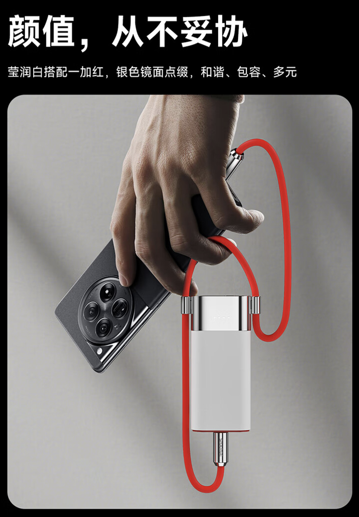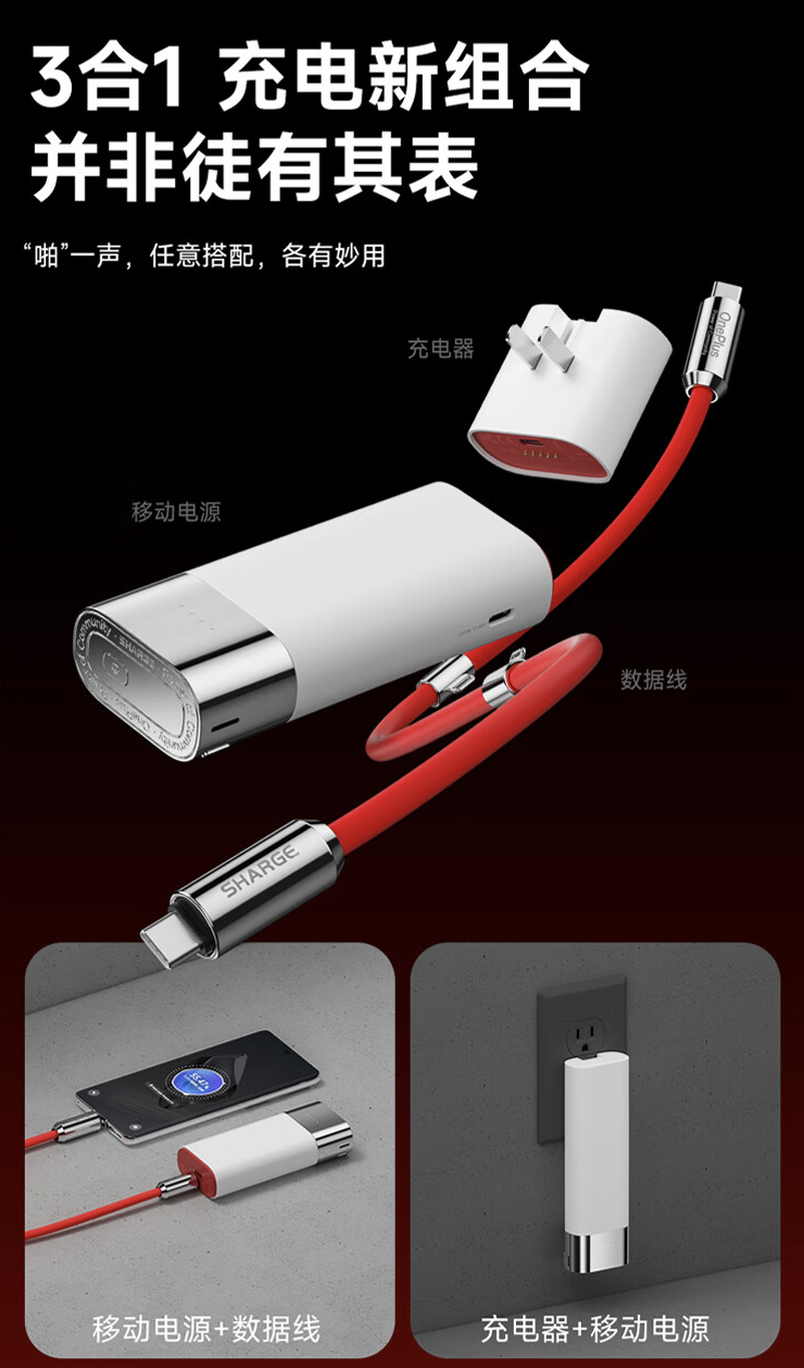 该产品由充电器(55W)、移动电源、数据线(支持 PD 100W 协议)三部分组成,可通过卡扣、磁吸、折叠、旋转进行多种状态组合,具备 1.6KG 磁吸力,充电器部分采用了可折叠插脚设计,数据线部分采用可旋转的伸缩金属保护罩。