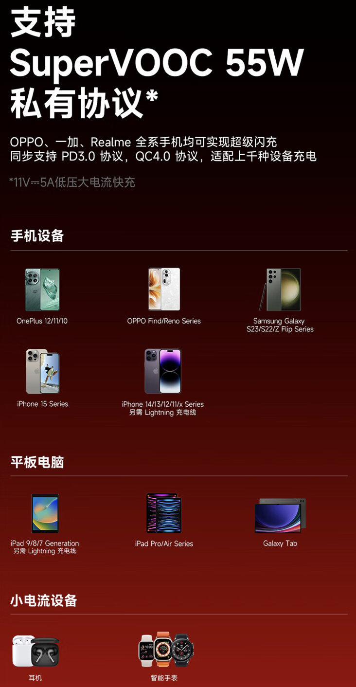 据介绍,这款移动电源采用 3 合 1 分离式设计,储能的同时还可以为设备充电,支持 SuperVOOC 55W(11V 5A)私有协议,OPPO、一加、realme 全系手机均可实现“超级闪充”,同步支持 PD3.0 协议、QC4.0 协议,号称适配上千种设备充电。