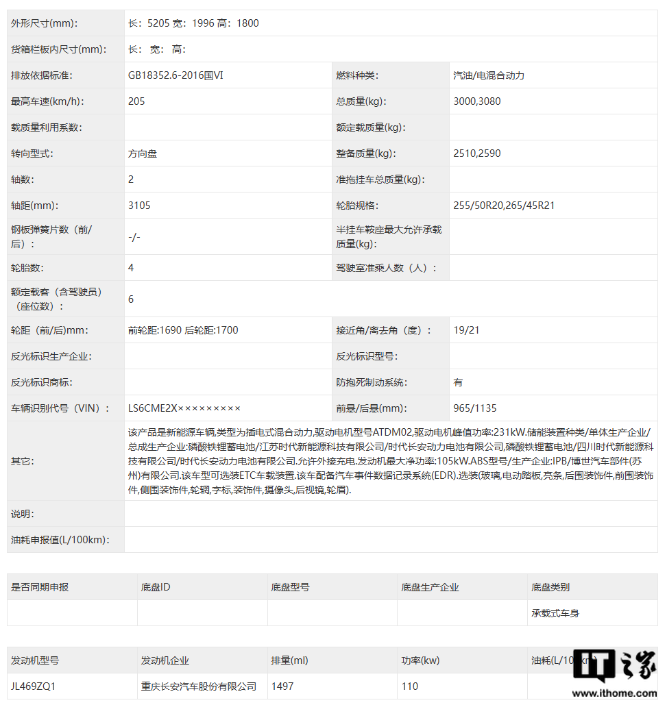 这款新车定位“插电式增程混合动力多用途乘用车”,长 5205mm、宽 1996mm、高 1800mm,轴距为 3105mm,前轮距 1690mm、后轮距 1700mm,额定载客(含驾驶员)为 6 位。此外,该车可选装玻璃方案、电动踏板、摄像头、后视镜等配置。