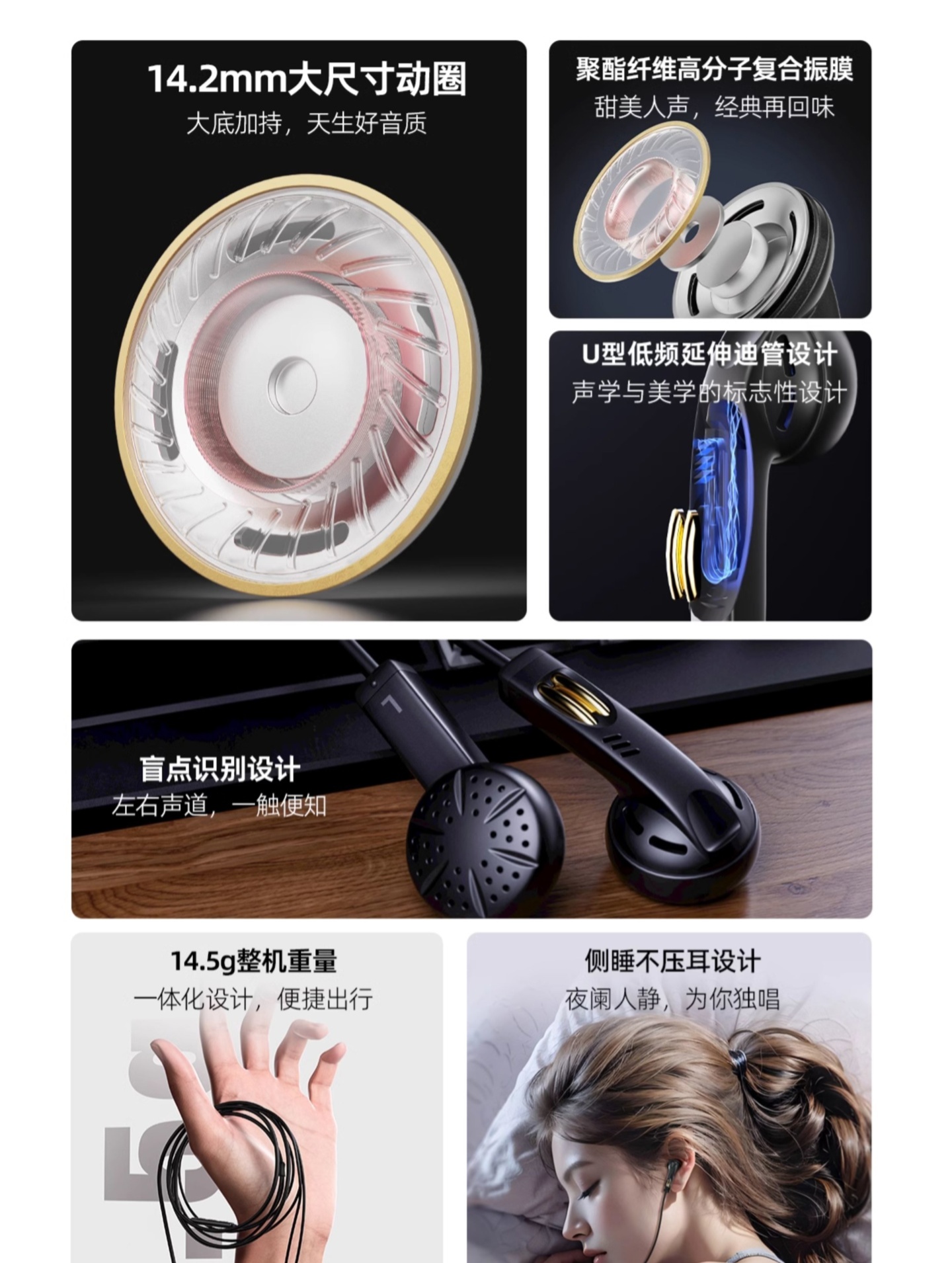 该款耳机采用 U 型低频延伸迪管设计,含线整机重量约 14.5g;耳机还沿袭“侧睡不压耳设计”,提供黑金色 / 白银色两款配色。