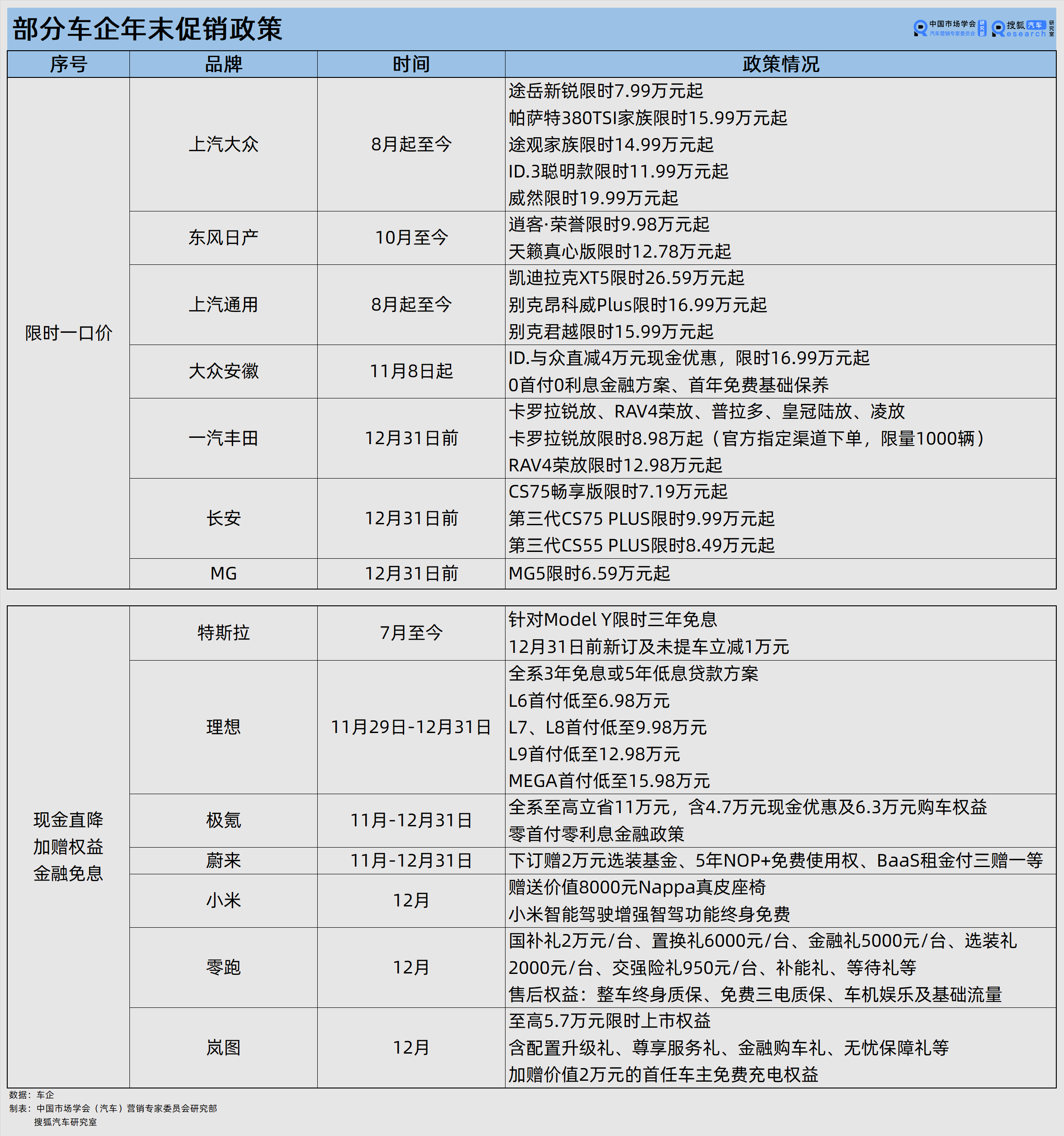 经搜狐汽车·汽车咖啡馆的不完全梳理,在各地方政府的报废更新补贴和置换更新补贴基础之上,目前车企促销的方式不外乎包括以“限时一口价”进行直降、赠送选装权益以及免息等三类方式。