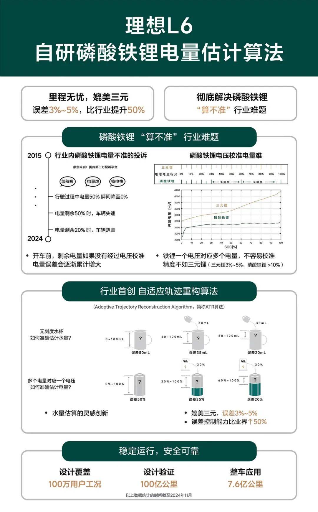 李想当初提到的这些问题,在理想汽车工程师团队的努力之下如今得到了解决,并且让L6上搭载的磷酸铁锂电池获得了接近于三元锂电池的体验。