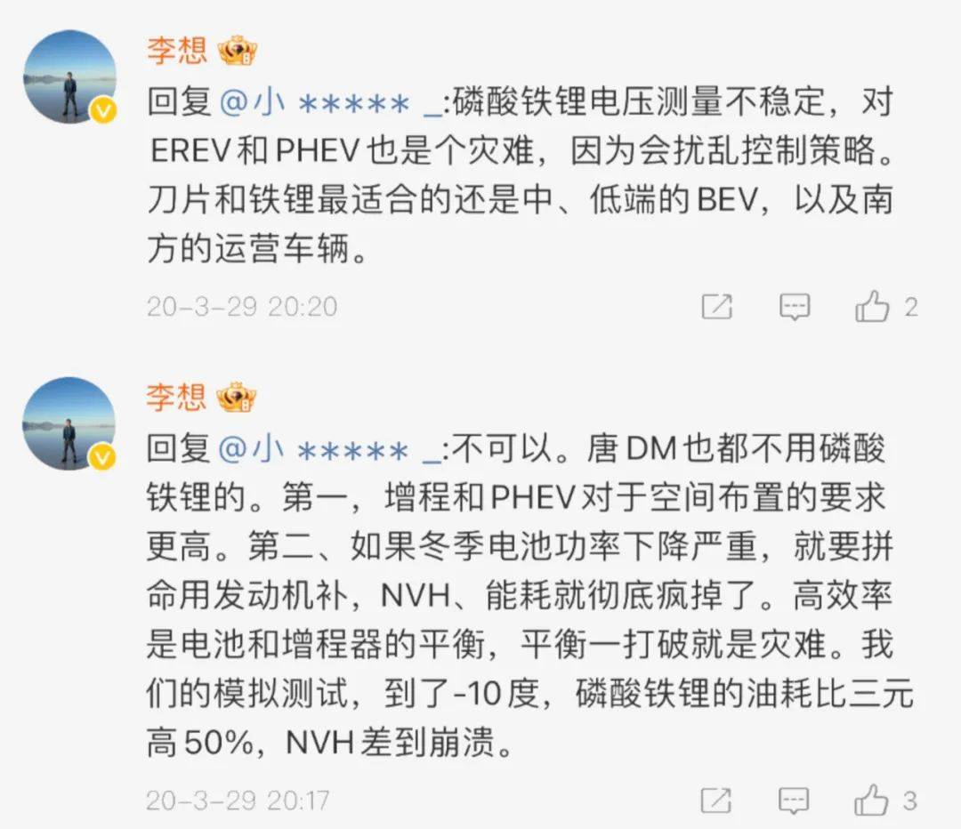 这也是当初李想表示不会在增程车上使用磷酸铁锂电池的原因。