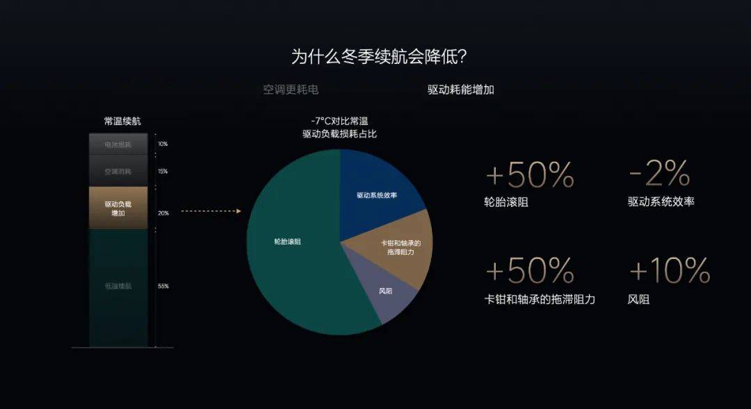 比如新能源车冬季续航降低的原因,大多数人能够理解是电池的效率降低,少数人可能还能回答出是空调消耗更大,但事实上,影响比重最大的却是驱动负载的增加,而导致驱动负载增加的最重要因素,是轮胎滚阻。