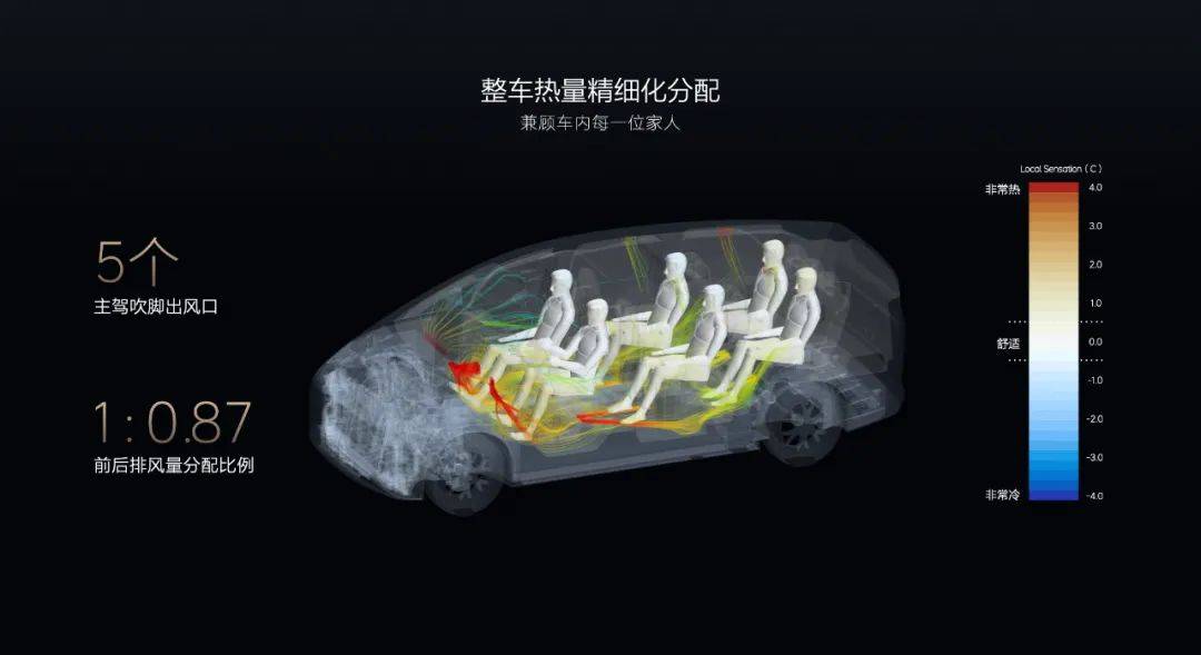 在制热能力保障的基础上,热量的精细分配既能降低能耗,也能提升乘员的舒适度——比如三排乘员需要均衡的温度体验,同时人体四肢的热需求高于躯干,头部又需要保持清爽。