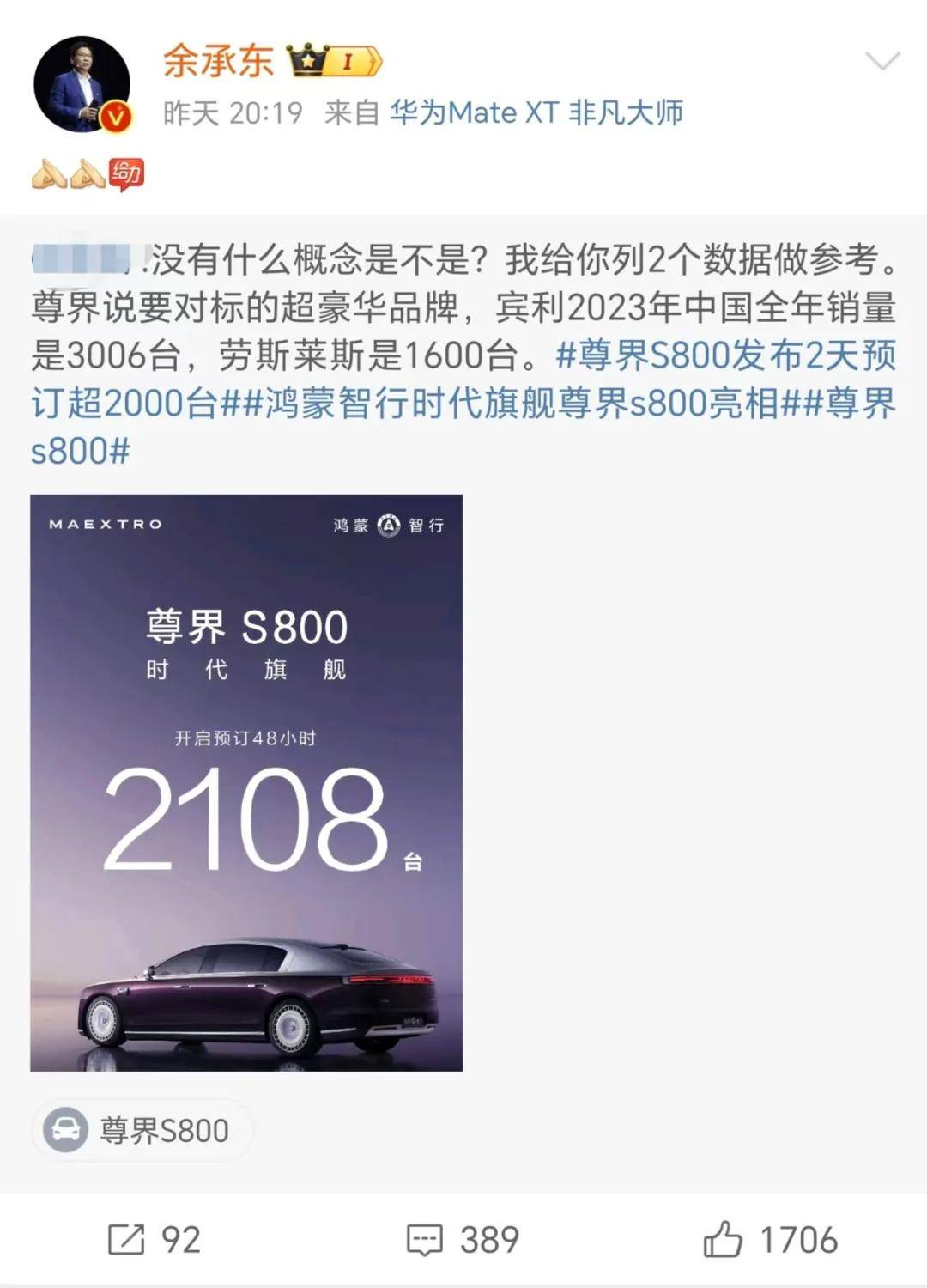 â€œæ²¡æœ‰ä»€ä¹ˆæ¦‚å¿µæ˜¯ä¸æ˜¯ï¼Ÿæˆ‘ç»™ä½ åˆ—2个数æ®ä½œå‚考。尊界说è¦å¯¹æ ‡è¶…豪åŽå“牌,宾利2023å¹´ä¸å›½å…¨å¹´é”€é‡æ˜¯3006辆,劳斯莱斯是1600è¾†ã€‚â€æœ‰ç½‘å‹åœ¨å¾®åšä¸Šè¯„论é“。