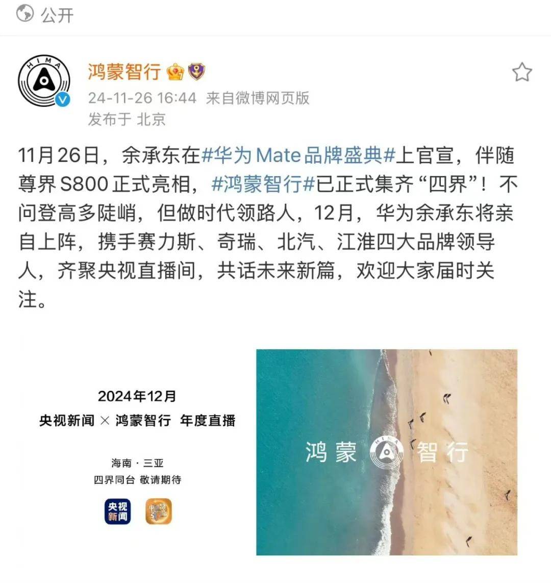 ä¼´éšå°Šç•ŒS800亮相,鸿蒙智行已集é½â€œå››ç•Œâ€ã€‚ä¸é—®ç™»é«˜å¤šé™¡å³ï¼Œä½†åšæ—¶ä»£é¢†è·¯äººã€‚12月,åŽä¸ºç›¸å…³è´Ÿè´£äººå°†æºæ‰‹èµ›åŠ›æ–¯ã€å¥‡ç‘žã€åŒ—æ±½ã€æ±Ÿæ·®ç‰4家车ä¼é¢†å¯¼äººï¼Œé½èšå¤®è§†ç›´æ’间。