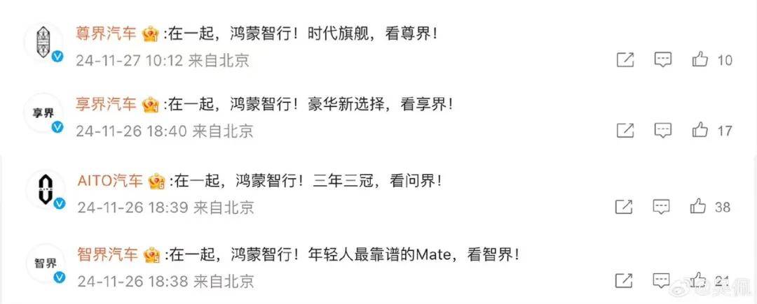 消æ¯ä¸€å‡ºï¼Œå°Šç•Œæ±½è½¦ã€äº«ç•Œæ±½è½¦ã€AITO汽车和智界汽车的官方微åšå‡äº’动呼应。
