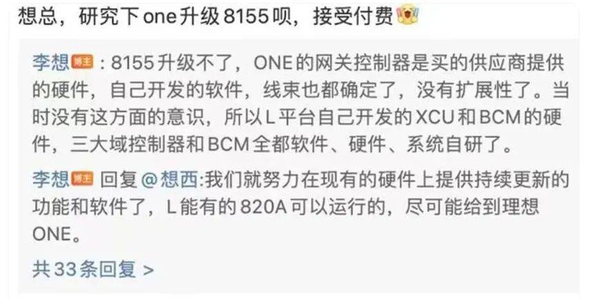 是因为在之前的4月,理想L8更新OTA 4.4版本车机,哨兵模式上线。彼时,就有理想ONE车主在理想CEO李想的微博里,特别咨询有没有可能给理想ONE“加钱付费”更换高通8155芯片。