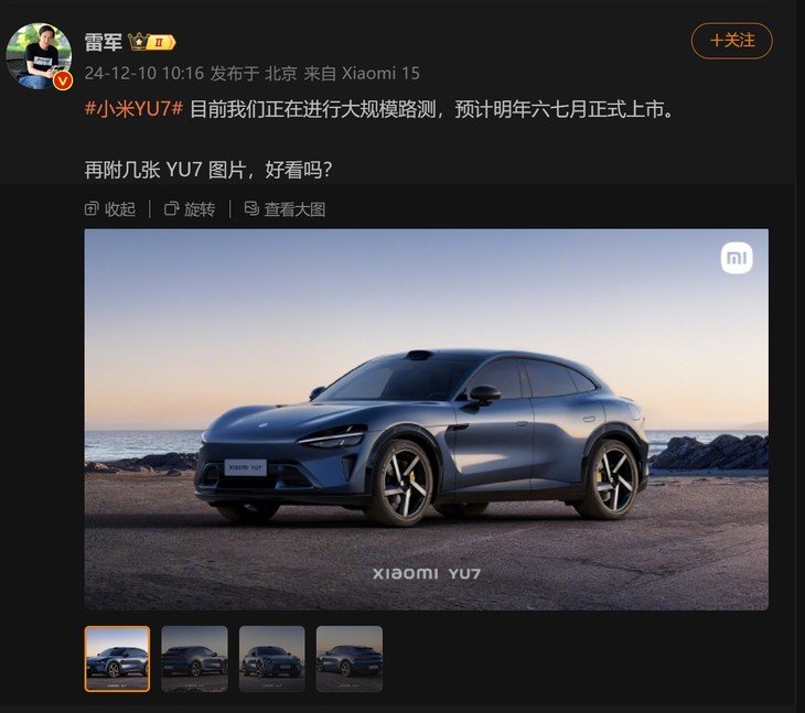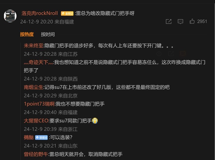然而,YU7的外型设计并非没有争议。与小米SU7不同的是,工信部的证件照显示,YU7放弃了半隐藏式门把手,改用了全隐藏式设计。这一变化引发了网友的热议,尤其是一些曾经认可小米SU7门把手设计的车主表示不满。雷军的微博评论区里,不少人希望小米能够重新考虑这一设计,甚至呼吁恢复SU7的半隐藏式门把手。
