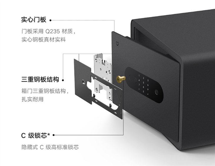 米家智能保管箱支持多达6种开锁方式,包括指纹识别、密码、一次性密码、双重验证、蓝牙和传统钥匙。指纹识别部分采用瑞典Precise Biometrics算法,具备99.2%的高识别率和不到0.5秒的快速响应时间。内置的米家安全芯片配合自研加密算法,保障了保管箱与用户手机的数据加密,进一步提升了安全性。