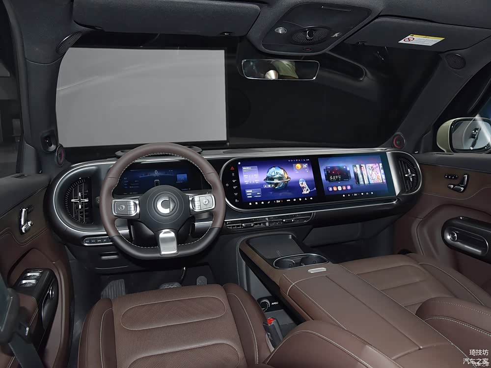 来到俩台车的车内,能看到更多的设计思路上的区别,一个是全面的科技氛围,另一个则是极简的风格。首先是在屏幕方面,smart精灵5号使用了10.3英寸的全液晶仪表,一块13英寸的中央屏幕,1块13英寸的副驾驶娱乐屏幕,HUD抬头显示的尺寸则直接做到了25.6英寸,提供更多的信息展现。
