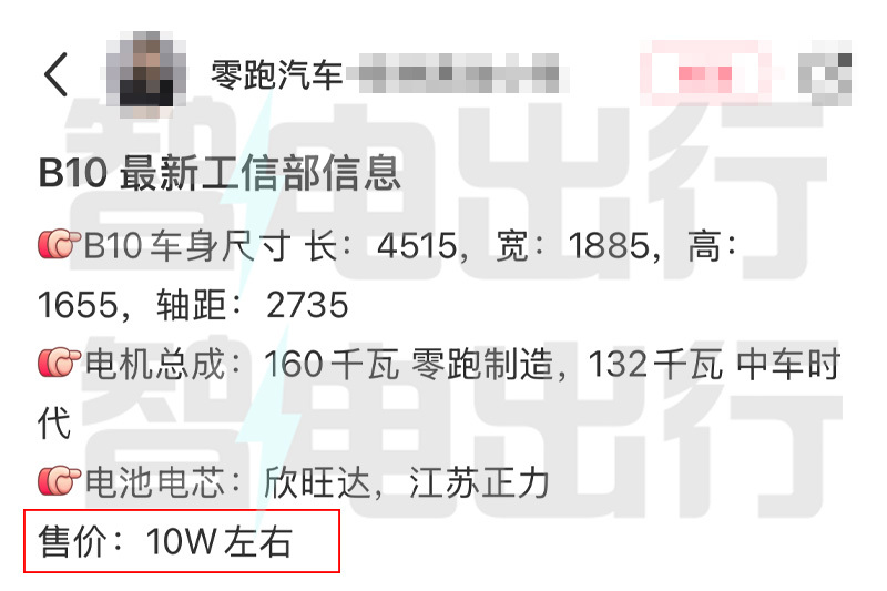 零跑B10纯电版已完成申报,将于明年1季度上市。车长4.515米,轴距2.735米,比比亚迪元PLUS大一圈。B10电机最大功率分别为132kW和160kW(低/高功率),匹配正力新能/欣旺达磷酸铁锂电池。零跑销售预计,B10售价在10万元左右。