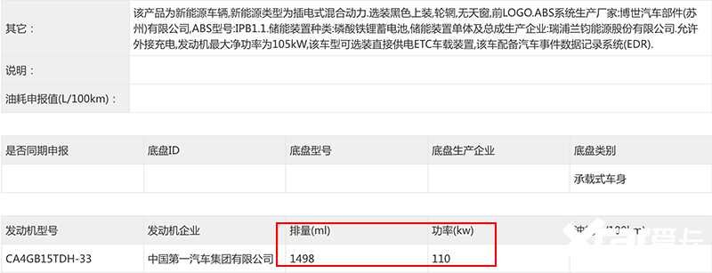 悦意07 1.5T插混发动机最大功率110km,匹配21.2kWh、30.9kWh两种电池,馈电油耗4.94L/100km、4.96L/100km。