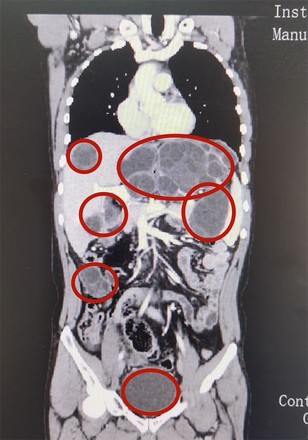 新婚不久的图尔逊今年32岁,两个星期前反复地出现腹部疼痛不适,遂在当地医院接受了腹部CT检查。检查结果把接诊医生吓了一跳:只见图尔逊的腹腔中有大大小小20余个肿块,最大的位于左上腹脾门区,长径近20厘米。肝脏上最大肿块直径也将近15厘米,其它的肿块大小不一,分布在腹腔各处。