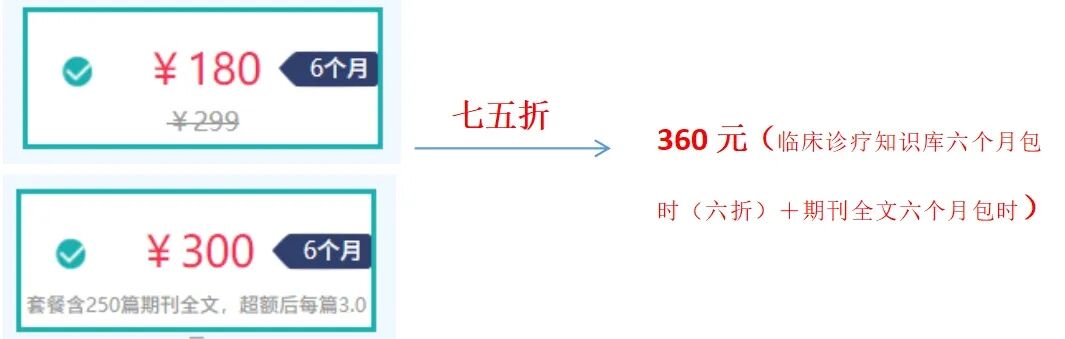 “1+1”特惠尊享包包括临床诊疗知识库六个月包时(六折)+医学期刊全文六个月包时套餐(套餐含250篇期刊全文,超额后每篇3.0元),也就是在单个包时六折的基础上,我们将整个服务包再打七五折,活动时间在11月6日-11月18日!针对不同用户的使用需求,我们还推出不同的包时服务,优惠多多,学术创作更安心,欢迎广大用户前来体验!