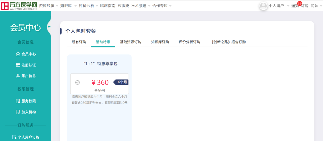 成功开通“1+1”特惠尊享包后,可在6个月内在线查看万方医学临床诊疗知识库资源和期刊全文(套餐含250篇期刊全文,超额后每篇3.0元)。