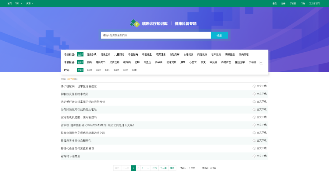 临床诊疗知识库由全国三级以上医院、科研院所的近5万名医学专家共同倾力打造而成,并由医学资深编辑参与临床诊疗知识内容的整理、编辑、校对工作,保证知识库内容的规范性。临床诊疗知识库改版后,首页资源分成三大模块,包含临床类、专题类和文献类。目前专题类新增健康科普专题,文献类模块包含指南共识、循证文献、病例文献、法律法规、药物不良反应。