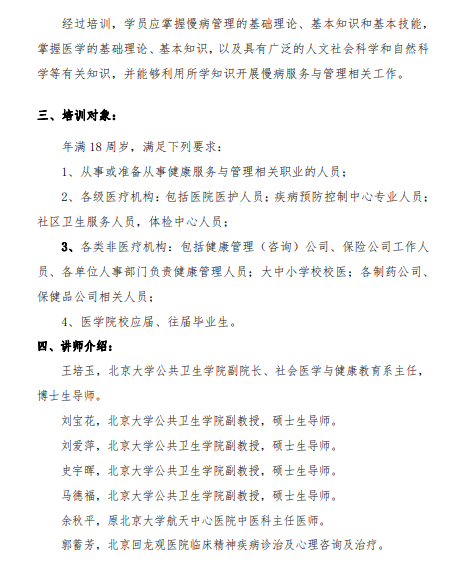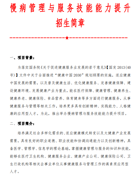 为落实国务院《关于促进健康服务业发展的若干意见》【国发 2013(40 号)】文件中关于全面推进“健康中国 2030”规划纲要的实施,适应健康中国发展的需要,以及普及健康生活、优化健康服务、完善健康保障、建设健康环境、发展健康产业为重点,能在医疗保障、健康管理、健康养生、健康养老、健康保险、食品营养、体育健身等多方面进行健康服务,从事健康服务与管理等相关工作,培养更多具有创新精神、实践能力、人格健康的应用型人才。为此,推出慢病管理与服务技能能力提升项目。
