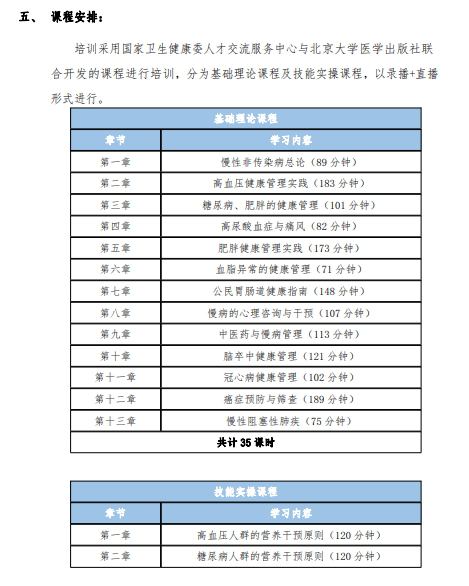 05课程安排培训采用国家卫生健康委人才交流服务中心与北京大学医学出版社联合开发的课程进行培训,分为基础理论课程及技能实操课程,以录播+直播形式进行。