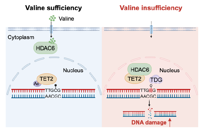 缬氨酸,作为一种必需的支链氨基酸,在蛋白质合成、神经行为、白血病进展中发挥着重要的作用。然而,细胞感应缬氨酸的机制与功能尚不清楚。为系统性鉴定缬氨酸的结合蛋白,研究团队通过质谱技术,筛选得到缬氨酸结合蛋白去乙酰化酶HDAC6,显示出与缬氨酸更强的结合能力。研究团队进一步发现,有别于灵长类(人和猴子)的HDAC6,鼠的HDAC6并不能与缬氨酸发生结合。这一发现揭示了不同物种在缬氨酸感应中的差异性,提示了物种进化在氨基酸感应中的重要作用。研究团队还通过诸多实验发现,细胞内缬氨酸匮乏能促进DNA损伤。由此,研究团队发现了全新的缬氨酸感应器,阐明了缬氨酸限制诱导DNA损伤的分子机制。
