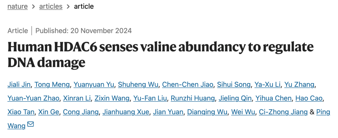 限制性饮食联合抑制剂治疗,能显著提升肿瘤疗效。北京时间今天(11月21日)零点,同济大学医学院、同济大学附属第十人民医院王平教授团队在国际顶级学术期刊《自然》(Nature)上发表题为“Human HDAC6 senses valine abundancy to regulate DNA damage”(人类HDAC6 通过感知缬氨酸丰度调控DNA损伤)的论文,提出缬氨酸限制性饮食联合DNA修复酶抑制剂治疗肿瘤的新策略。这也是团队研究成果时隔9个月后再登《自然》。