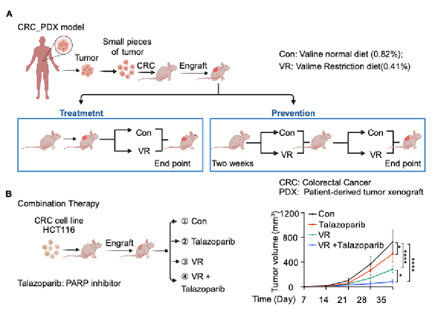 饮食限制或者靶向氨基酸代谢和感应,已成为延长寿命和癌症等多种疾病治疗的辅助策略。研究团队进而研究发现,在结直肠癌异种移植瘤和预防组、治疗组病人来源的异种移植肿瘤模型中,适宜的缬氨酸限制饮食(质量比为0.41%缬氨酸)可显著抑制肿瘤生长,同时产生的副作用较小。此外,缬氨酸限制性饮食和DNA修复酶抑制剂talazoparib(他拉唑帕利)联合治疗显著增强抗肿瘤效果,这为该疗法通过诱导DNA损伤治疗癌症提供了有力的证据。