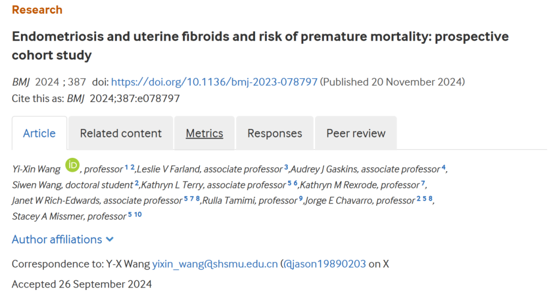 上海交通大学公共卫生学院汪一心研究员为本文独立一作兼独立通讯作者。其他作者包括哈佛大学陈曾熙公共卫生学院J.E. Chavarro教授,密西根州立大学S. A. Missmer教授、K.L Terry教授、S. Wang博士,埃默里大学A.J. Gaskins教授,布莱根女子医院J.W. Rich-Edwards、K.M. Rexrode教授,亚利桑那大学L.V. Farland教授,以及康奈尔大学威尔康奈尔医学院R. Tamimi教授。