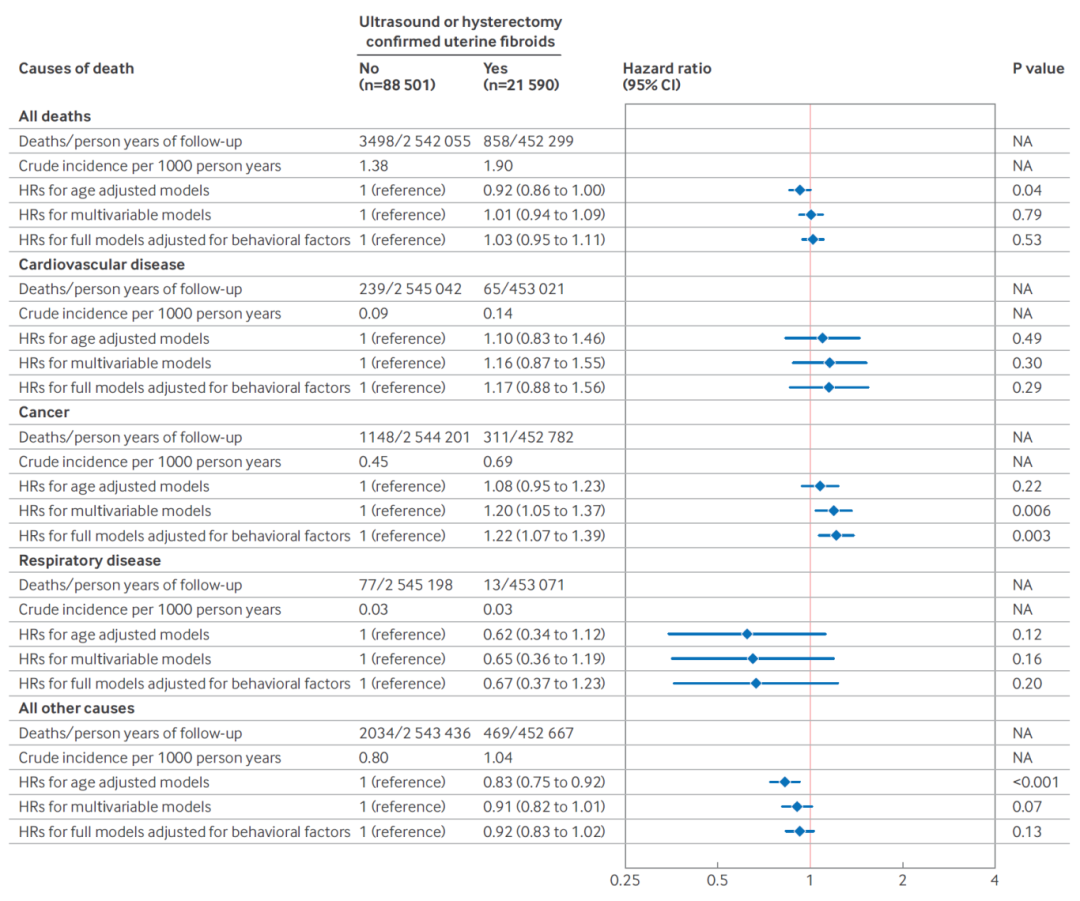子宫肌瘤与后天早亡风险之间无著性关联(HR=1.03, 95% CI: 0.95-1.11)。但原因别死亡分析结果显示,子宫肌瘤会增加因肿瘤早亡的风险(HR=1.22, 95% CI: 1.07-1.39),尤其是是因妇科肿瘤早亡的风险(HR=2.32, 95% CI: 1.59-3.40)。与未患该两种妇科疾病的女性相比,同时患有子宫内膜异位症和子宫肌瘤的女性具有更高的因心血管疾病早亡的风险(HR=1.61 [95% CI,0.93-2.76])。进一步的分层和交互作用分析提示,子宫内膜异位症与早亡之间的关联不受种族、膳食、吸烟、BMI、体力活动、激素替代治疗、不孕症、自发流产、月经紊乱以及口服避孕药或阿司匹林等因素的影响,提示子宫内膜异位症是早亡的独立危险因素。但在有子宫切除术史的女性中,观察到患子宫肌瘤反而与早亡和因癌症早亡的风险降低有关,提示子宫切除可降低子宫肌瘤发展为癌症的风险。