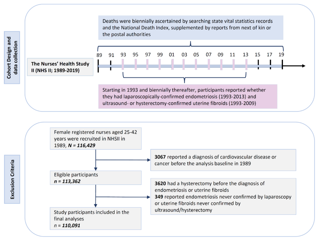 子宫内膜异位症(Endometriosis)是一种女性生殖系统的慢性疾病,其特征是子宫内膜组织在子宫以外的部位生长。子宫肌瘤(Uterine fibroids)是由子宫平滑肌细胞增生引起,其中含少量纤维结缔组织,是一种临床上常见的良性妇科肿瘤。据估算,全球女性子宫内膜异位症和子宫肌瘤患病率分别高达10%和15-30%。JAMA、NEJM等顶尖医学期刊先后发表多篇综述探讨子宫内膜异位症和子宫肌瘤的潜在健康效应,但其对死亡的影响仍知之甚少。两种疾病有着相似的发病机理,且往往又伴随着子宫切除、卵巢切除、激素替代治疗等临床治疗,导致分析脉络错综复杂。