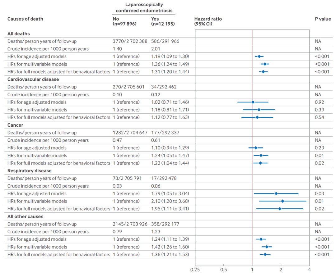 本次研究的研究人群来自护士健康研究Ⅱ(Nurses’ Health Study II,NHSII)。该队列于1989年启动,招募了116429名年龄在25-42岁的女性护士(平均年龄:34.7±4.7岁),通过邮件或电子问卷对研究对象每两年随访一次,详细收集其生殖特征、生活方式和健康状况等数据。自1993年起,每两年询问一次是否患有由腹腔镜确诊的子宫内膜异位症、由超声或子宫切除术确诊的子宫肌瘤。为了验证数据的可靠性,S. A. Missmer教授带领团队分别于1994年和2011年两次对比了自报子宫内膜异位症和子宫肌瘤与临床诊疗记录的一致性,发现NHSII研究对象自报的子宫内膜异位症和子宫肌瘤灵敏度均超过93%。本次研究排除了在基线患有心血管疾病或肿瘤的3067人,诊断子宫内膜异位症或子宫肌瘤前已切除子宫的3620人,以及未经腹腔镜确诊的子宫内膜异位症患者或未经超声或子宫切除术确诊的子宫肌瘤患者(349人),最终纳入110091名研究对象。在30年的随访期间(1989-2019),共观察到4356例早亡,其中304例死于心血管疾病,1459例死于癌症,90例死于呼吸系统疾病。患有子宫内膜异位症的女性在随访期间粗死亡率显著高于未患子宫内膜异位症的女性(死亡率分别为2.01 和1.40/1000人年),总死亡相对风险比(Hazard Ratio,HR)为1.19(95% CI: 1.09-1.30)。调整混杂因素和生活方式后,相对风险比进一步加强 (HR=1.31, 95% CI: 1.20-1.44)。原因别死亡分析结果显示,子宫内膜异位症增加了因肿瘤(HR=1.22, 95% CI: 1.04-1.44)、呼吸系统疾病(HR=1.95, 95% CI: 1.11-3.41)和神经系统疾病(HR=2.50, 95% CI: 1.40-4.44)早亡的风险。