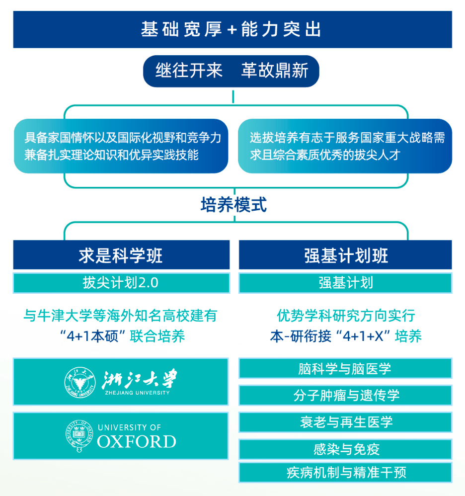 依托竺可桢学院,实施“基础医学引领、临床医学支撑、多学科交叉融合”培养,形成脑科学与脑医学、分子肿瘤学与遗传学、衰老与再生医学、感染与免疫、疾病机制与精准干预五大优势专业方向,培养具有创新能力兼备家国情怀和国际视野的创新拔尖人才。