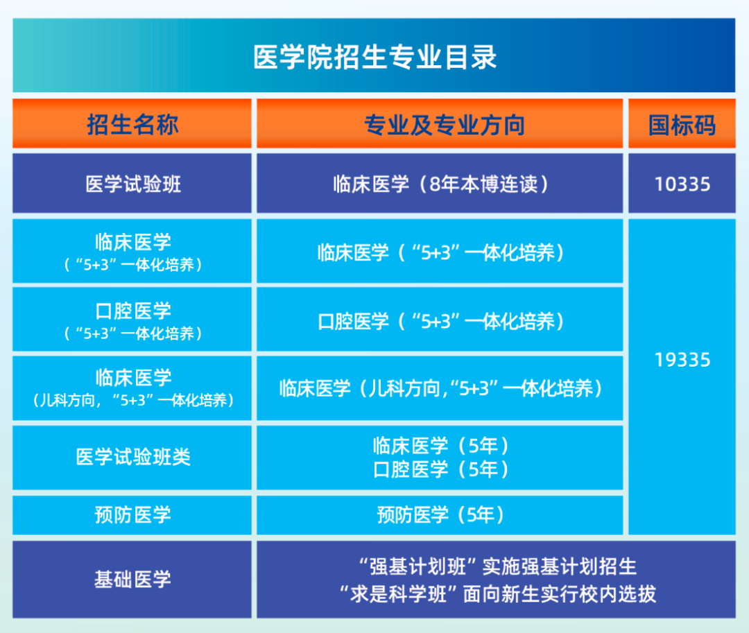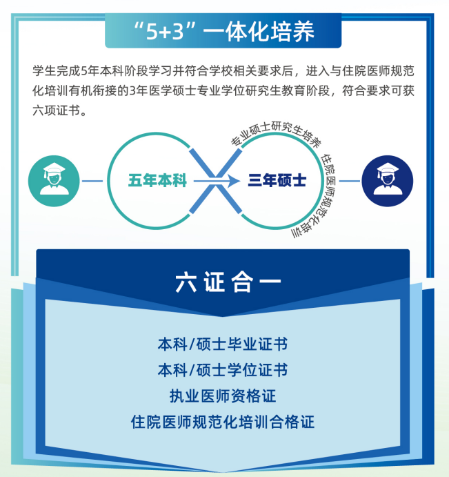 五年制/“5+3”一体化培养:采用“宽口径、厚基础、重临床、国际化”培养模式,在国内率先采用“见习医生制”教学模式,实现“早临床、多临床、反复临床”,强化医学人文教育、创新素质培养和国际竞争力提升,培养卓越医学人才。