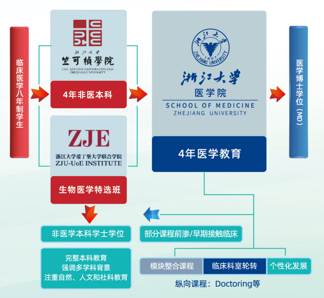 医学试验班(八年本博连读):采用国内首创的“八年一贯、两段完整”的“4+4”医学博士培养模式,前四年依托竺可桢学院攻读非医本科,部分学生可进入生物医学专业(爱丁堡大学联合培养),浸润多元学科背景,后四年进入医学博士(MD)培养阶段,融汇科研创新与临床能力培育,培养医学拔尖创新人才。