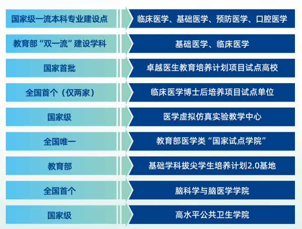 学院创立以多学科交叉驱动“医学+”复合型拔尖创新人才培养模式和以“模块化课程”“见习医生制”为核心的临床医学课程新体系,获多项国家级教学成果奖;毕业生连续十年国家临床执业医师资格考试通过率全国领先;实行“拔尖创新人才国际交流计划”,为本科生提供多元化多途径的海外交流机会。