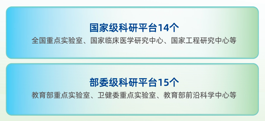 五家附属医院连续五年蝉联全国三级公立医院绩效考核最高等级,3家综合性附属医院蝉联最高等级A++,2家专科性附属医院蝉联最高等级A。现有国家临床教学培训示范中心3家(数量居全国首位),牵头建设1个国家传染病医学中心、6个国家区域医疗中心和1个首批国家紧急医学救援基地,入选国家医学中心首批“辅导类”创建单位、全国公立医院高质量发展试点单位。