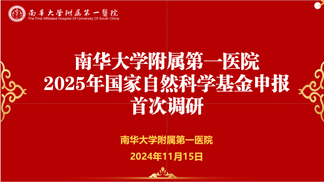 为精准摸底我院(南华大学附属第一医院)学科骨干国家自然科学基金申报选题方向、科学问题凝炼、科研工作积累情况,全面推动2025年国家自然科学基金高质量申报,科研与学科建设部在分管院领导谭钢副院长的部署与指导下于2024年11月15日正式启动了2025年国自申报学科调研工作。