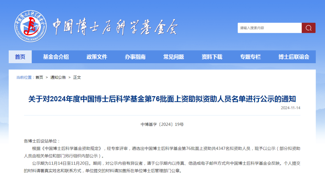 第76批中国博士后科学基金面上项目资助名单(2024.11.14)