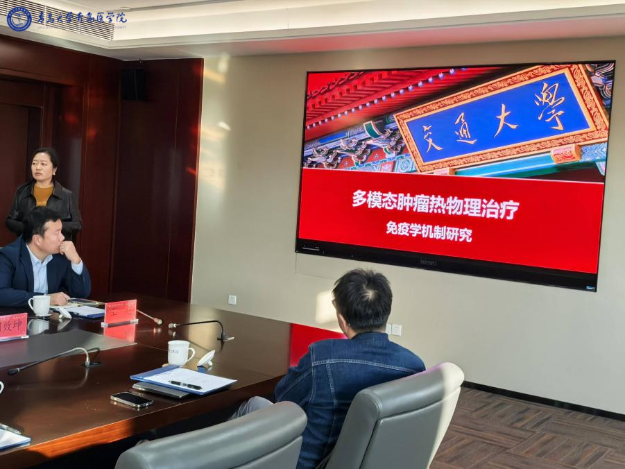 上海交通大学生物医学工程学院副院长孙建奇介绍上海交通大学医工交叉转化情况。上海交通大学生物医学工程学院刘苹教授汇报多模态肿瘤治疗免疫机制研究情况。