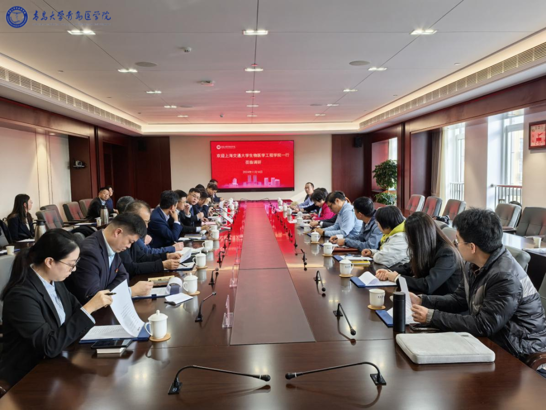 11月18日下午,上海交通大学生物医学工程学院一行来访,座谈会在会议中心302会议室举办。上海交通大学原副校长、医学科学院学部委员、讲席教授徐学敏,青岛大学党委常委、副校长牛海涛,上海交通大学生物医学工程学院副院长孙建奇,青岛医学院党委书记、附属医院党委书记蒋光峰,青岛医学院常务副院长李冰、副院长王建勋,第一临床医学院副院长、附属医院平度院区党委书记姜彦,青大医疗集团副院长、附属医院胃肠外科主任卢云,附属海慈医院副院长陆学超等参加活动。座谈会由青岛医学院院长任贺主持。
