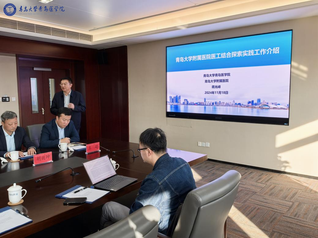 蒋光峰介绍青大附院的基本情况,应客人的要求着重讲解在学科建设、医工交叉融合、科研成果转化等方面的运行机制和取得的成绩。