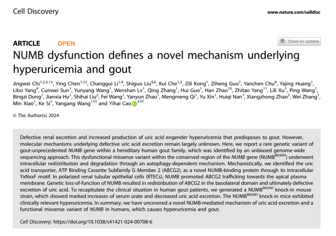 研究团队证明了NUMBR630H变异会导致NUMB基因功能缺失,引起尿酸经肾脏排泄障碍导致血尿酸盐水平升高,进一步揭示了NUMB介导尿酸转运蛋白极性运输这一高尿酸血症与痛风发生的新机制,加深了对尿酸代谢调节机理的认识,为治疗高尿酸血症与痛风的药物研发提供了新的靶点。