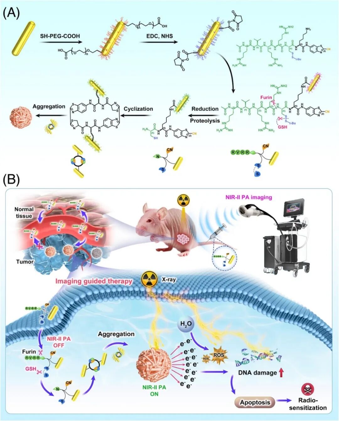 目前的放射治疗缺乏准确区分肿瘤组织和健康组织的能力,导致患者遭受严重的放射损伤。因此,迫切需要精准的放疗技术,以优化肿瘤控制,同时最大限度地减少对周围健康组织的不良影响。在这项研究中,作者开发了一种由弗林酶响应的RVRR肽偶联的金纳米棒组成的纳米药物(AuNR@Peptide),它将可激活的成像探针和放射增敏剂整合到一个系统中,用于精确的肿瘤定位,实现图像指导的精准放疗。静脉给药后,生物标志物(弗林酶)对AuNR@Peptide上的RVRR底物进行蛋白水解,触发金纳米棒组装成更大的聚集体,由于金纳米粒子间的等离子耦合效应从而激活近红外二区光声信号,此外,粒径更大的聚集体通过阻止金纳米棒的迁移和回流来增强其瘤内滞留,从而提高其辐射敏感性。注射后在肿瘤部位观察到近红外二区光声信号的峰值时间点可作为启动X-射线辐射时间点的参考,并通过与放射增敏机制相关的研究阐明增敏机制,体内实验表明其放疗效果有实质性改善。本研究将影像与治疗相结合,为肿瘤提供了一种有前景的影像指导治疗方式。